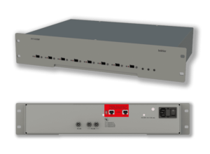 INFRACOM Infrared-Transmitter Band IV, for transmission of max. 8 channels, RJ45 connector for DIGIMIC system bus, daisy chain socket for additional ICen DM, cascadable via BNC link socket BNC, 2 outputs (BNC) for connection of 10 INFRACOM radiators at each socket, dimension: (19″, 2HU) 433x88x305mm (WxHxD), rackmount chassis, aluminum silver anodized, front steel “iron grey” RAL 7011, weight: 4.75 kg