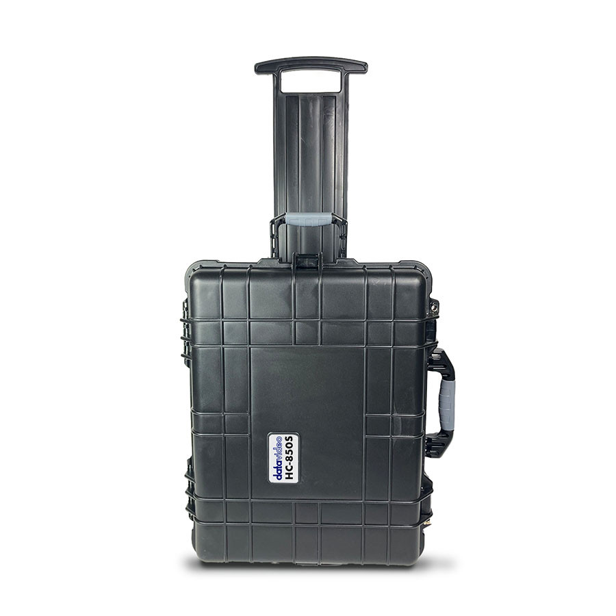 Datavideo – Water/dust resistant high impact case with wheels. It comes with custom cut foam to fit the Showcast 100 and its power supply.