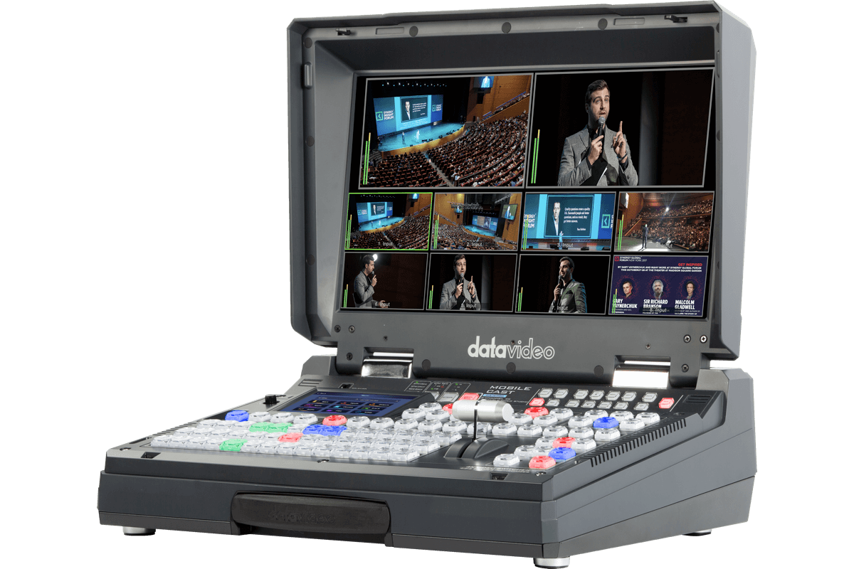 Datavideo – 12 channel 4K30 or 8 channel 4K60 hand carried mobile studio with built-in 17.3″ LCD monitor, H.265 streaming encoder, and recorder.
