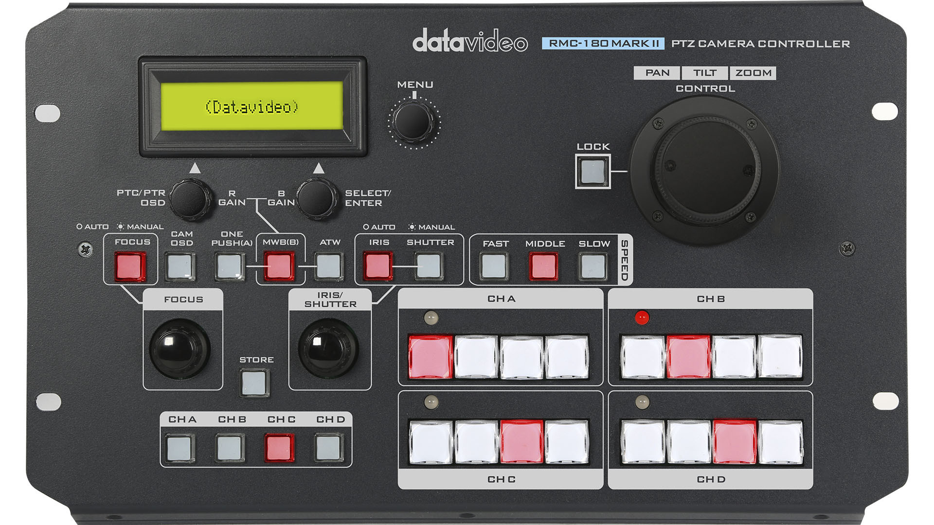 Datavideo – Camera control unit for the PTZ cameras. Can control up to 4 cameras and save 4 presets per camera or if controlling 2 cameras, save 8 pre
